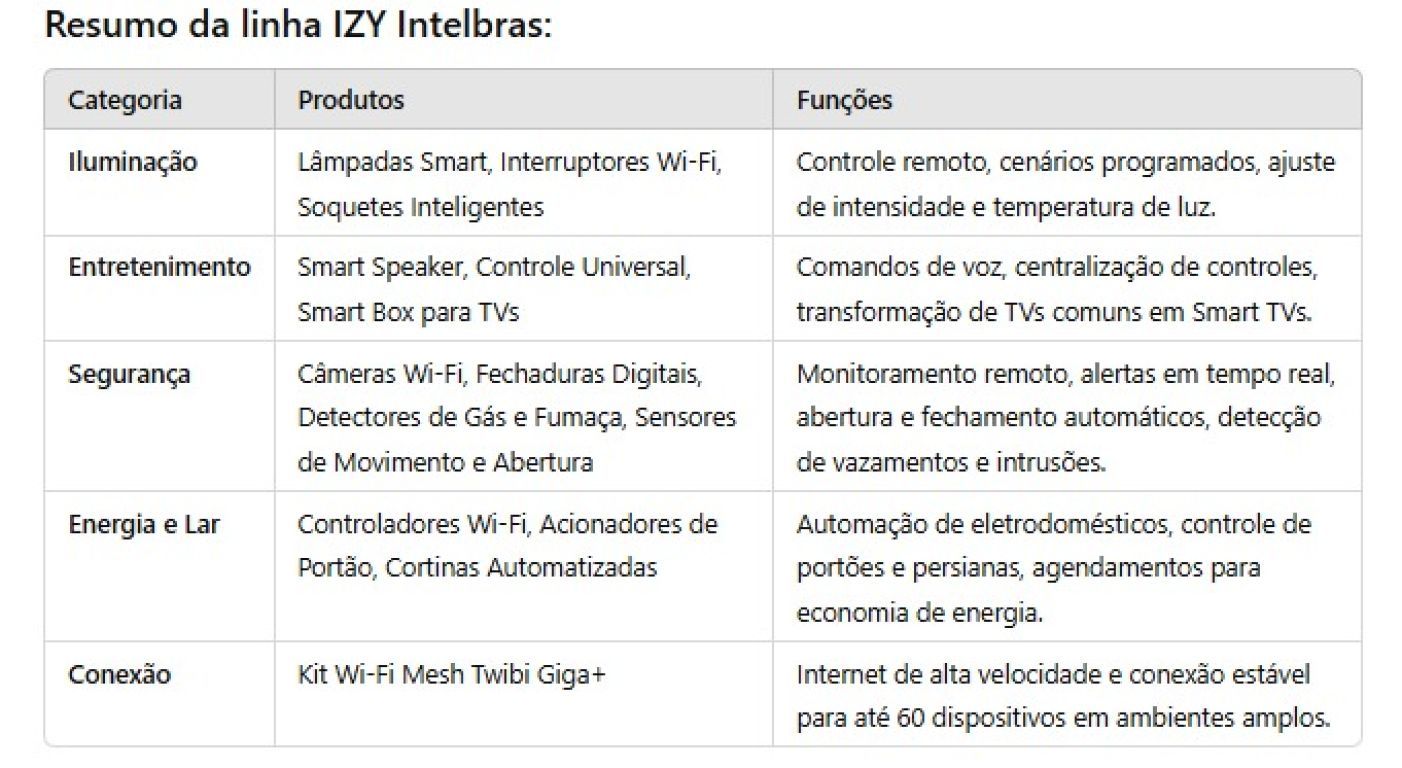 A linha inteligente da Intelbras oferece praticidade e segurança com tecnologia de ponta. Controle sua casa pelo celular com câmeras Mibo, fechaduras digitais, interruptores touch, tomadas smart, sensores e muito mais. Torne qualquer ambiente mais seguro, conectado e eficiente, com comandos por voz, aplicativo ou programação automática.